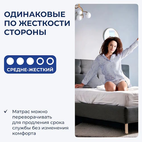 Высота Глории – 30 см. Степень упругости «два в одном». С одной стороны –жесткое покрытие уровня «средний», а с другой – мягкое. Комплектуется несъемным чехлом (полиэстер и вискоза) и «дышащим» материалом 3D SPACE. Стежка – терморегулируемый холлофайбер. Ограничений по весу нет.